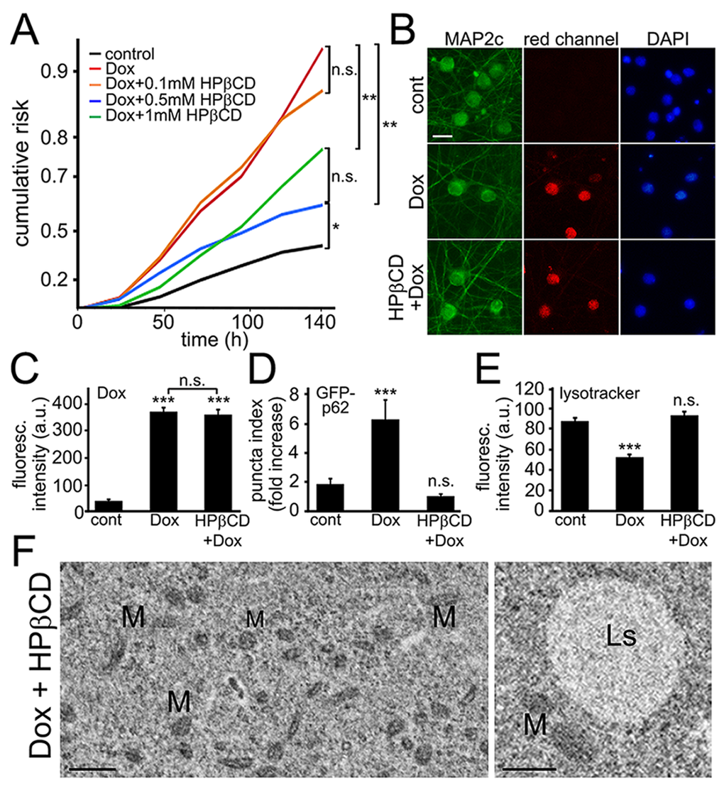 Next, to confirm that HPβCD contributes to autophagy and is neuroprotective, we tested if the degradation of p62 is changed in the presence of HPβCD. Three neuronal cohorts were transfected with p62-GFP and mApple. The first cohort was treated with a vehicle; the second neuronal cohort was treated with doxorubicin; a third cohort was treated with doxorubicin and HPβCD. Indeed, co-treatment of doxorubicin and HPβCD lowered the levels of p62 in doxorubicin-treated neurons, suggesting that TFEB indeed enhanced the autophagic capacity in neurons (Fig. 6D).