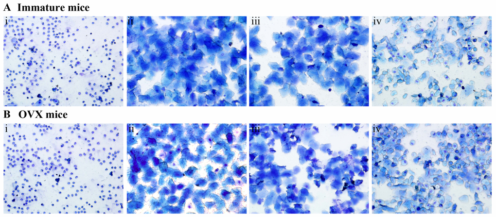 Immature mice and OVX mice were monitored by daily vaginal epithelium cells smear testing during the 7-day and the last week of 4-week administration period, respectively. The vaginal lavage was fixed with 95% ethanol for 10 min and stained with methylene blue for 10 min [38]. Vaginal epidermal cells were observed by microscopy, and keratinized vaginal cells were taken as being indicative of estrus. All mice were sacrificed by decapitation. Blood was collected from the eyeball and 40 μL serum for analysis of estradiol (E2), follicle-stimulating hormone (FSH) and luteinizing hormone (LH) levels by enzymelinked immunosorbent assay (ELISA) (Beijing Xinfangcheng Biotechnology, China) [39]. The sensitivities ofthethree ELISA assays were 1.0 pg/ml, 1.0 mIU/ml and 1.0 ng/ml respectively and not soluble structural analogues with other cross-reaction, and all the intra-assay and inter-assay variation of each hormonal assay were less than 9% and 15%.
