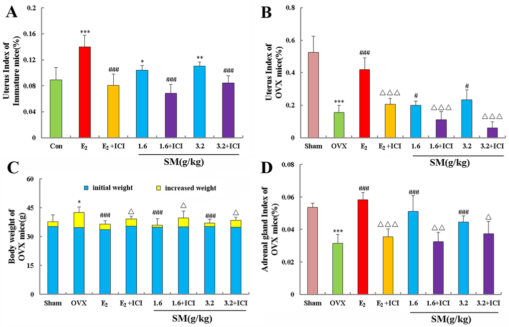 The mice from all eight groups had similar initial mean body weights. At the end of the study, the mean body weight of mice in the OVX group was significantly higher than that of the sham group. A treatment with SM or E2 completely prevented the increase in body weight associated with E2 deficiency (Fig. 2C). The results suggested that SM could prevent body weight gain in postmenopausal women and had a better ability in reversing the body weight gain caused by ovariectomy than that of E2. As expected, the mean adrenal gland weight of OVX animals was significantly lower than that of sham controls as shown in Figure 2D. E2 treatment dramatically increased the adrenal gland weight of OVX mice compared with untreated control (p < 0.001). SM treatment had critical effects on adrenal gland weight gain, because a high dose of 3.2 g/kg of SM induced a 1.4-fold increase in adrenal gland weight compared with untreated OVX mice. ICI induced the decrease of adrenal gland index which was increased with E2 or SM treatment.