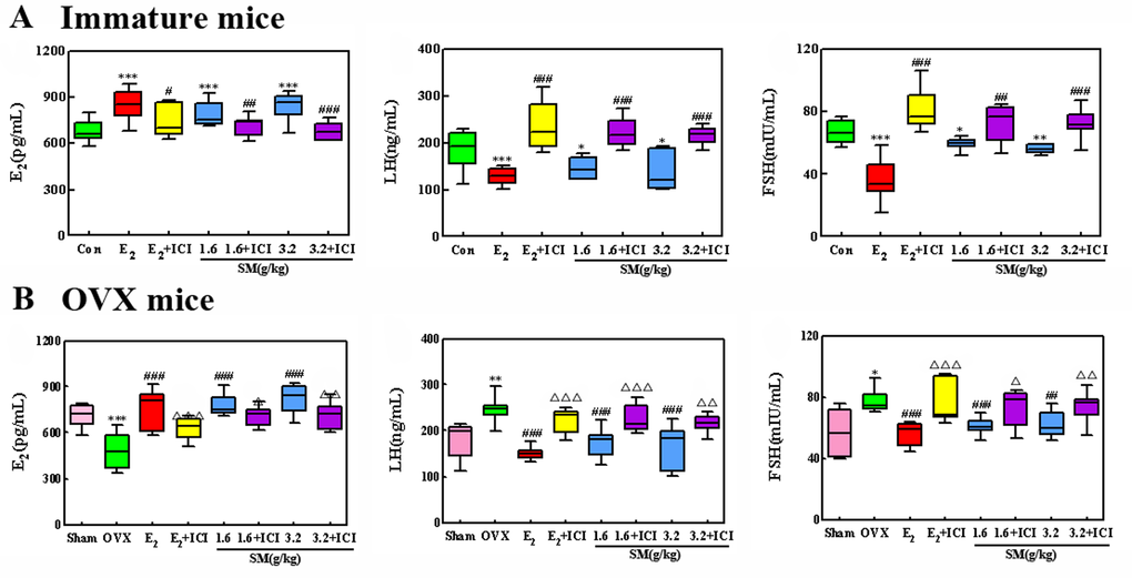 To characterize the estrogenic activity of SM on the reproductive tissues of immature mice and OVX mice, we compared the activity of SM with a synthetic estrogen, estradiol, and combine with the ER antagonist ICI182, 780 administration for elucidating the ER mechanism.