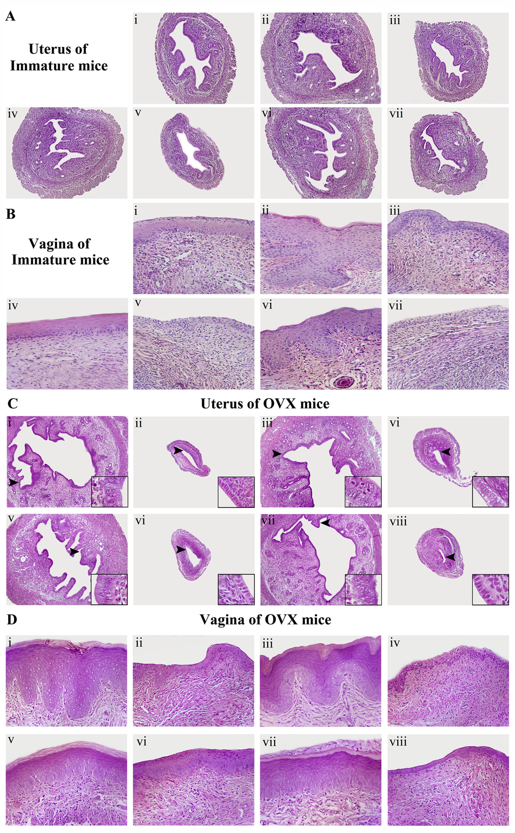 These morphologic findings of all animals were quantified and presented in Table 1. In the untreated vagina, 8~11 cell layers were observed. Compared to untreated immature mice, the E2-treated animals (Fig. 4B ii) displayed a typical squamous multilayered epithelium, where approximately 10 ~ 16 cell layers were observed in all 10 samples. In 1.6 g/kg SM-treated animals, epithelium thickness and the number of cell layers were augmented in some areas. The treatment with 3.2 g/kg SM (Fig. 4B vi) increased epithelial thickness and the number of cell layers (11~13 layers). While, in SM + ICI group, the growth and development of uterus and vagina were decreased, with a similar effect to E2 + ICI group.