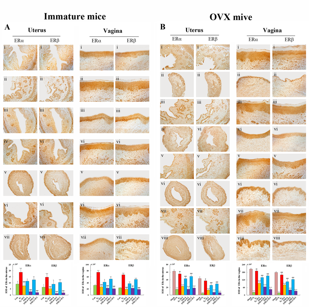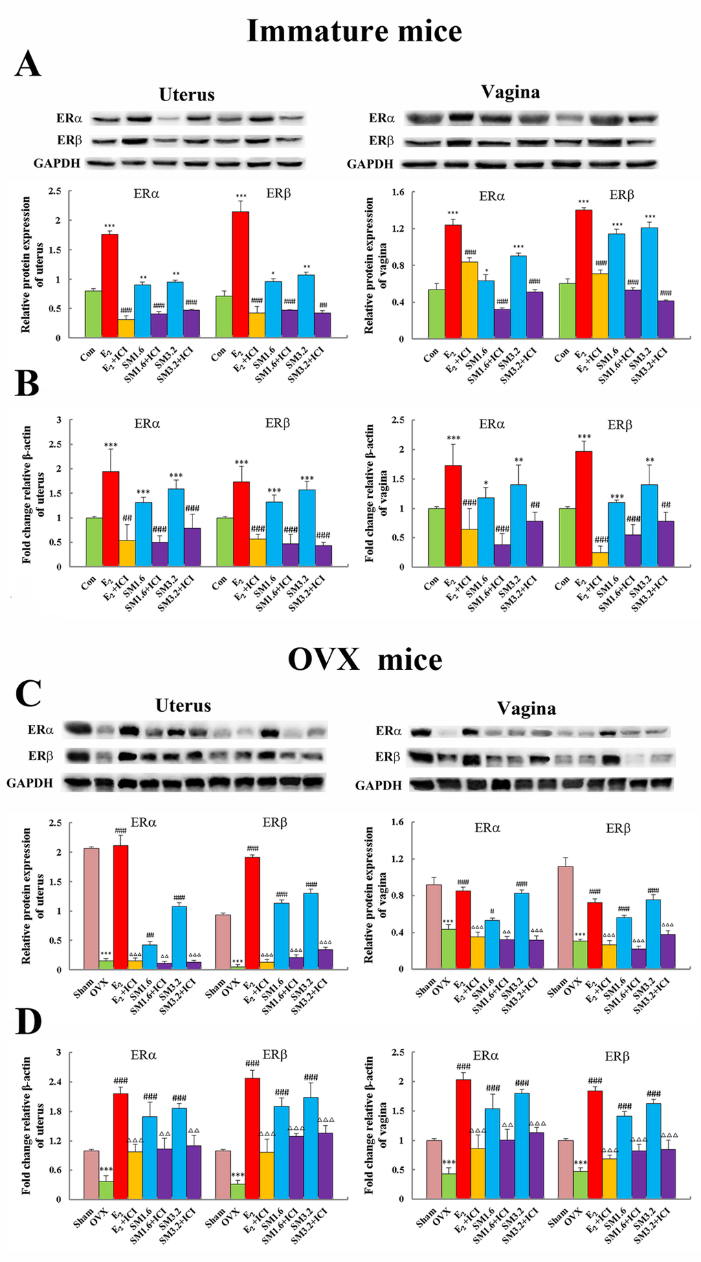 Figure 5A, B shows representative sections of the expressions of ERα, ERβ in the uterus and vagina from each group and their corresponding quantitative analysis in immature and OVX mice. Treatment with either E2 or SM at any doses significantly increased ERα and ERβ expression in the uterus and vagina, compared with the untreated group in immature (P < 0.05, P < 0.01 or P < 0.001) or OVX mice (P < 0.01, P < 0.001), respectively. ERs in the uterus were expressed in the epithelial cells of the endometrium, interstitial cells, and smooth muscle cells. ERs in the vagina were expressed in the vaginal epithelium cells of squamous and smooth muscle cells. While, the expressions of ERα, ERβ in the uterus and vagina decreased in SM + ICI group, with a similar effect to E2 + ICI group.These data further support the hypothesis that SM mediates its activity in vivo through ERs.