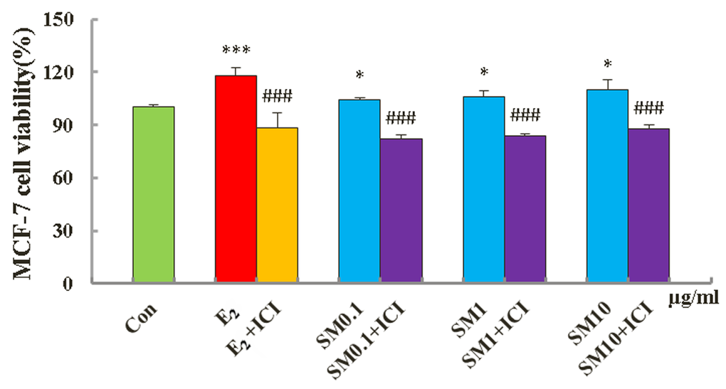 To further investigate the molecular basis of SM activity, we used MCF-7 human breast cancer cells as the model because they are bound to estrogen for growth in monolayer culture. As shown in Figure 7, treatment with SM at dose levels of 0.1~10 μg/mL and 0.01 μM 17 β-estradiol both stimulated proliferation of MCF-7, demonstrating estrogenic activity in the SM extracts. The SM + ICI mixture inhibited the proliferation of MCF-7 cells compared with SM treatment alone and resulted in significant differences (all P < 0.001), which is supported by an observation that the estrogenic activities of SM were significantly inhibited by the specific ER antagonist ICI182, 780.