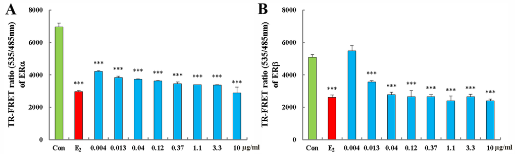 The estrogenic activities of SM were significantly inhibited by the specific ER antagonist ICI 182, 780 in vivo and in vitro. We next examined if SM could directly bind to ER using a TR-FRET ER competitive assay. As shown in Figure 8, SM could bind to human ERα and ERβ ligand binding domain (LBD) in the dose range of 0.013~ 10 μg/mL. As the concentration increased, the combination was enhanced.