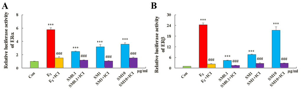 HEK 293 cells that had been stably transfected with the hERα /β -ERE-luciferase plasmid were used to measure the formation of functional hERα/β -ERE complexes in response to treatment with SM and individual compounds. Results are expressed relative to expression in DMSO-treated cells. 0.1~10 μg/mL SM and 0.01 μM 17 β-estradiol both induced ERα and ERβ -ERE luciferase activities (Fig. 9). SM at 10 μg/mL induced a 2.58-fold increase in ERα and a 20.31-fold increase in ERβ luciferase activity. These effects were ablated when treatments were administered in the presence of the specific ER antagonist ICI182, 780, resulting in 57% and 87% inhibition of ERα and ERβ-ERE-luciferase expression in cells treated with 10 μg /mL SM, respectively. These data indicate that SM clearly has estrogenic activity that is stimulated through the activation of ERs.