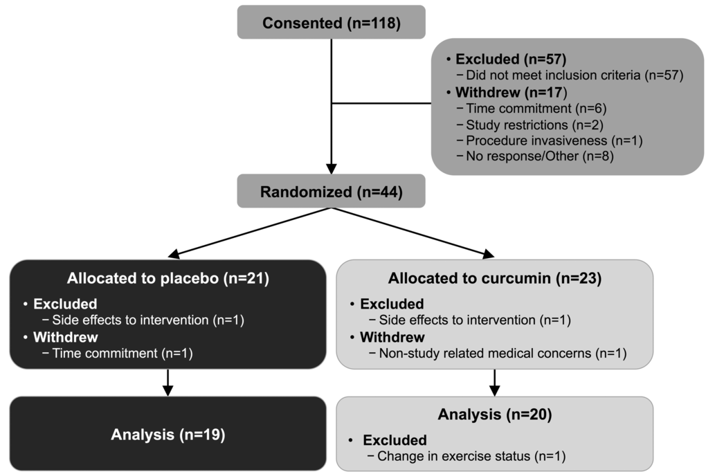 One hundred and eighteen participants were consented for the study. Fifty-seven individuals did not meet inclusion criteria. Seventeen individuals withdrew from the study prior to randomization due to the time commitment (n=6), study restrictions (n=2), procedure invasiveness (n=1), or did not respond to scheduling requests (n=8). Twenty-one participants were randomized to the placebo group and twenty-three participants to the curcumin group. Two placebo group participants did not complete the study (excluded n=1, side effects: gastrointestinal discomfort; withdrew n=1, time commitment). Two curcumin group participants did not complete the study (excluded n=1, side effects: dizziness; withdrew n=1, non-study related medical concerns) and one participant was excluded from analysis due to a change in exercise status (Figure 1). Completed participants were of non-Hispanic Caucasian (n=32), non-Hispanic Asian (n=3), Hispanic Caucasian (n=2), non-Hispanic African American (n=1), or non-Hispanic American Indian/Alaskan (n=1) ethnicity.