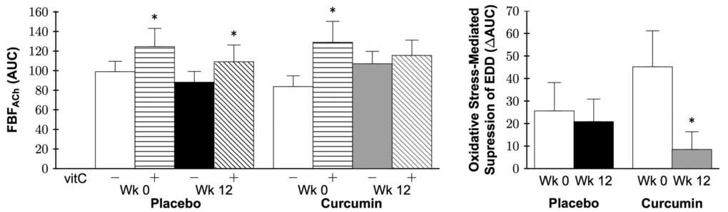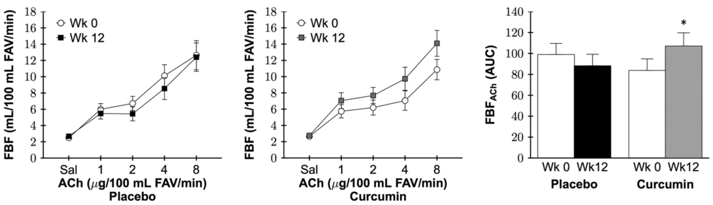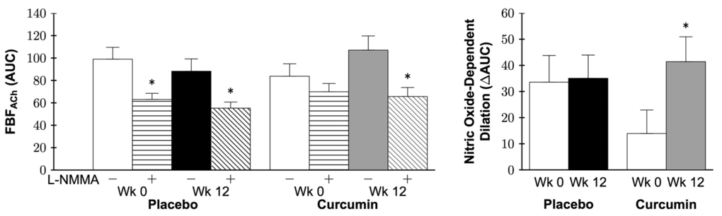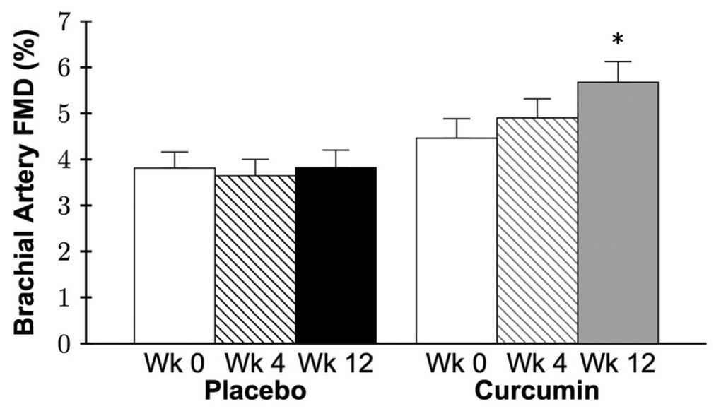 A preclinical study performed by our laboratory [51] demonstrated that 4 weeks of curcumin-supplemented chow restored nitric oxide-mediated ex vivo carotid EDD in older (26-28 months) male mice to levels of young (4-6 months), with no effect in young mice. In humans, 8 weeks of curcumin supplementation improved brachial artery FMD in healthy Japanese postmenopausal women [59], similar to a new report in young adults [60].