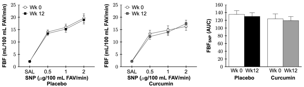 Forearm blood flow response to incremental intrabrachial artery infusion of acetylcholine (FBFACh) was assessed as a measure of resistance artery endothelial function in a subset of participants (n=12 per group) due to difficulty placing intra-arterial lines in all participants both before and after the intervention period. FBFACh area under the dose-response curve (AUC) was not different between the placebo and curcumin groups at baseline (P=0.3). FBFACh AUC had a group by time interaction between the placebo and curcumin supplementation groups (P=0.02). FBFACh AUC increased 37% after 12 weeks of curcumin supplementation (P=0.03), whereas there was no change with placebo (P=0.2; Figure 2). Individual FBFACh AUC at baseline and week 12 for each group are presented in Supplemental Figure 1. FBFACh AUC was higher after 12 weeks of curcumin vs. baseline in 9 of the 12 participants treated with curcumin compared with only 2 of the 12 placebo group participants. No sex differences in FBFACh AUC in the curcumin-supplemented group were observed (P=0.2). Resistance artery endothelium-independent dilation, a measure of vascular smooth muscle sensitivity to nitric oxide assessed as the increase in FBF in response to the nitric oxide donor sodium nitroprusside (FBFSNP), was not different between the placebo and curcumin groups at baseline (P=0.5) and did not change with time between groups (P=0.9; Figure 3).