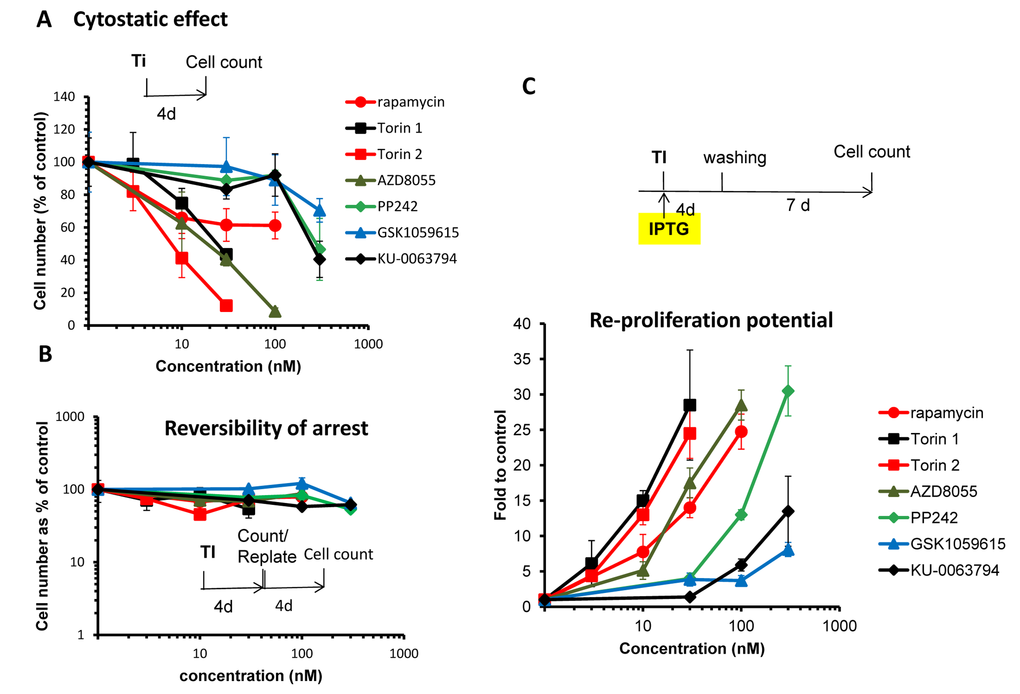 First we investigated the relationship between cytostatic and gerosuppressive activities of 6 pan-mTOR inhibitors: Torin1, Torin 2, AZD8055, PP242, KU-006379 and GSK1059615. All inhibitors inhibited proliferation in a dose-dependent manner (Fig. 1A). Inhibitory concentrations 50 (IC50) varied: Torin1 (22 nM), Torin 2 (8 nM), AZD8055 (20 nM), PP242 (285 nM), KU-006379 (230 nM) and GSK1059615 (>300 nM). At IC50, no cell death was observed. The inhibitory effect was cytostatic rather than cytotoxic and, furthermore, reversible (Fig. 1B). When cells were treated with pan-mTOR inhibitors for 4 days and then re-plated and incubated in drug-free medium, the cells re-proliferated as efficiently as untreated control cells (Fig. 1B).