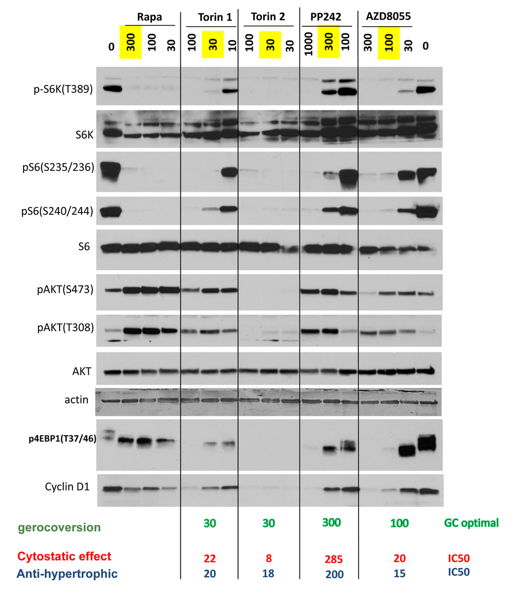Gerosuppressive effect of pan-mTOR inhibitors (as measured by RPP) was equal to that of rapamycin because it is mostly associated with inhibition of the S6K/S6 axis. Yet anti-hypertrophic effect as well as prevention of SA-beta-Gal staining and large cell morphology was more pronounced with pan-mTOR inhibitors than with rapamycin. Also, at optimal concentrations, all pan-mTOR inhibitors extended loss of re-proliferative potential in stationary cell culture more potently than rapamycin. This test determines hyper-metabolism and lactic acid production and is an equivalent of “yeast CLS” (see [83]. One conclusion is that pan-mTOR inhibitors may be superior to rapamycin.