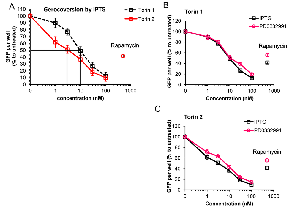 We next employed additional method of measuring cellular hypertrophy by measuring GFP under CMV-constitutive promoter in HT-p21 cells. (HT-p21 cells are stably transfected with GFP-CMV). It was previously shown that GFP accumulation is a marker of hypertrophy [82]. Torin 2 was more potent anti-hypertrophic agent than Torin 1 (Fig. 4A). IC50 values were 3 nM and 10 nM for torn 1 and 2, respectively (Fig. 4A). At 30 nM, both Torins were more anti-hypertrophic than rapamycin (Fig. 4A, rapamycin was used at 500 nM). Anti-hypertrophic effect of Torins was independent of the nature of senescence-inducing agent, i.e. IPTG-inducible ectopic p21 or inhibitor of CDK4/6 PD0332991 (Fig. 4B, C). We conclude that Torins blocked senescence-associated hypertrophy more effectively compared with rapamycin. Furthermore, Torin 1, which is more rapamycin-like than Torin 2, was less potent as anti-hypertrophic agent than Torin 2.