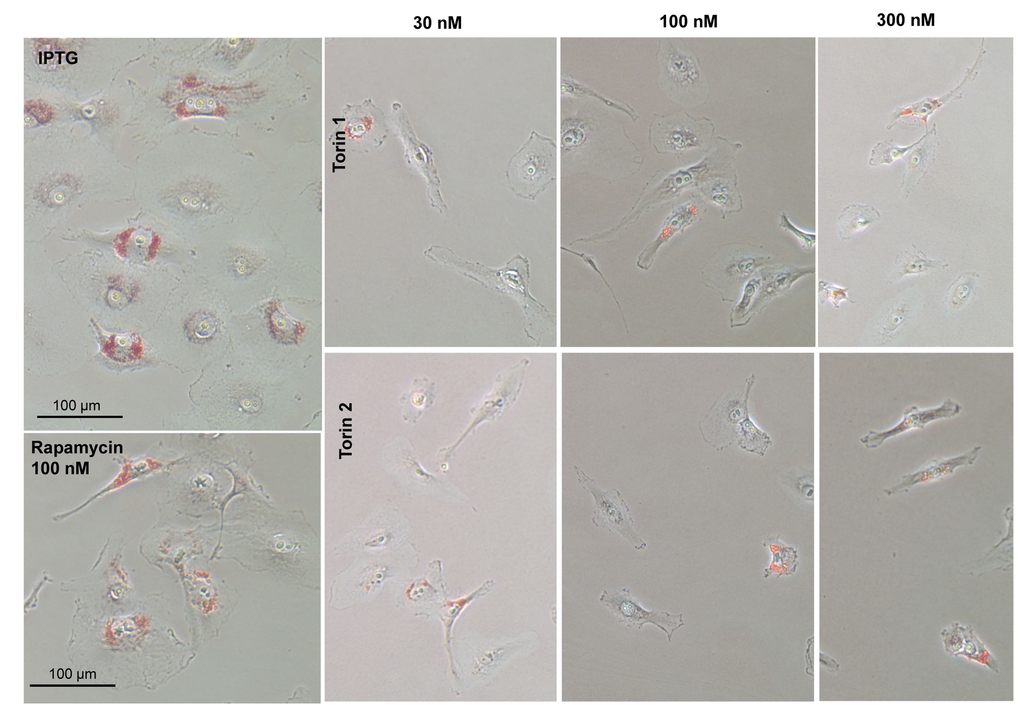 One of the features of senescent HT-p21 cells is accumulation of lipids, which is detected as positive Oil Red O staining in perinuclear region (Fig. 5, IPTG). When these cells were co-treated with IPTG and Torins 1 or 2, cells remained small and Oil Red O negative (Fig. 5). As in the case of SA-beta-Gal staining, rapamycin was less effective than Torins in decreasing this marker of senescent HT-p21 cells.