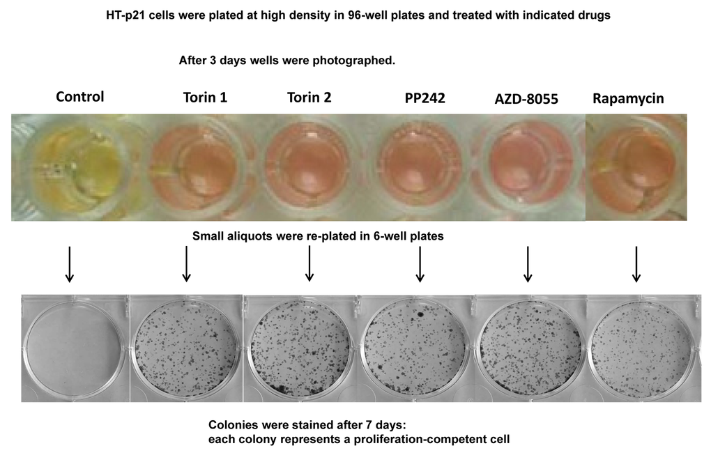 The yeast is commonly used as a model of aging. In particular, rapamycin extends chronological lifespan (CLS) [2]. In stationary culture, yeast cells lose viability measured as re-proliferative potential in fresh culture [1–7]. It is erroneously believed that “chronological aging” is an equivalent of aging of post-mitotic cells in multicellular organism. In reality, this phenomenon is an equivalent of lose of cancer cell viability in overcrowded culture [83]. Both yeast and cancer cells acidify the culture medium and lose viability, as measured for example by re-proliferation in fresh low-density culture. When plated at very high cell density, HT-p21 cells produce high levels of lactic acid, acidifying medium (“yellow color”). This causes loss of re-proliferative potential [83]. Rapamycin extends CLS by decreasing lactate production [83]. Here we tested whether pan-mTOR inhibitors can extend CLS of HT-p21 cells. After 3 days in a high-density culture, HT-p21 cells remained alive, but could not re-proliferate and form colonies when re-plated in fresh medium (Fig. 6, control). When high-density cultures were treated with mTOR inhibitors, these cells produced less lactic acid as seen by the color of the medium (Fig. 6; yellow indicates low pH and high levels of lactic acid) [84]. They maintained re-proliferative potential and formed colonies when re-plated in fresh medium in low density (Fig. 6). Rapamycin was less effective than pan-mTOR inhibitors. At equipotent (optimal) concentrations, all pan-mTOR inhibitors showed similar efficacy in prolonging chronological life span.