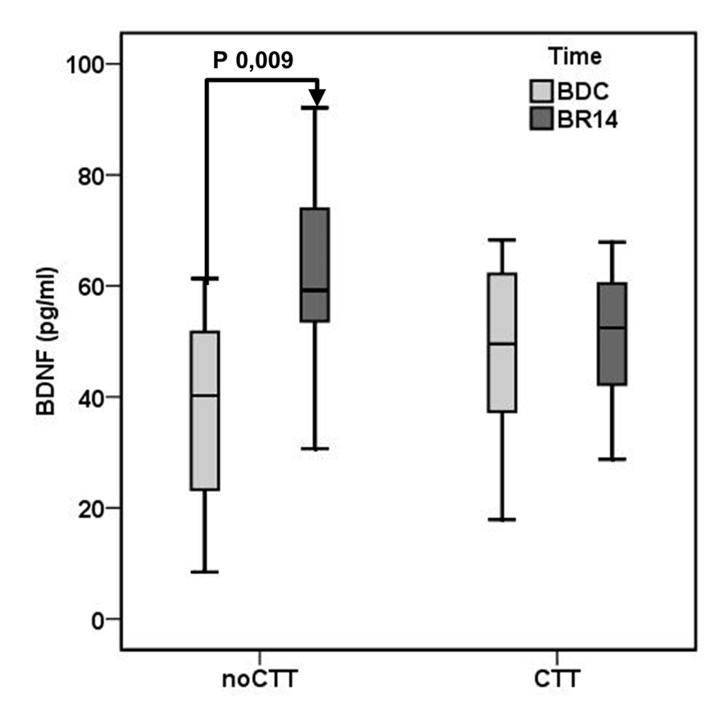 After 14 day of bed rest (BR14) a significant increase in plasma BDNF was observed in the noCCT group (BDC 37.53±18.58, BR14 62.02±18.31 pg/ml, P 0.009) but not in the CCT group (BDC 47.81±18.57, BR14 50.62±14.69 pg/ml, P 0.372) (Figure 1).