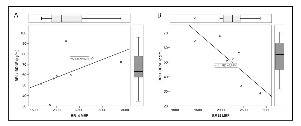 Continuous variables were expressed as mean (Standard Deviation) or, when necessary, as median (interquartile range). Categorical variables were expressed as number/percentage. At BDC, means were compared by one way ANOVA, while medians were compared by non-parametric tests (Kruskal Wallis). Normality of distribution was tested with Shapiro-Wilk test. Variations between BDC and BR14 in BDNF plasma levels and the other variables of interest were analysed by T-test for repeated measures and General Linear Model (GLM) Repeated Measures, Within-Subjects and Between-Subjects test.