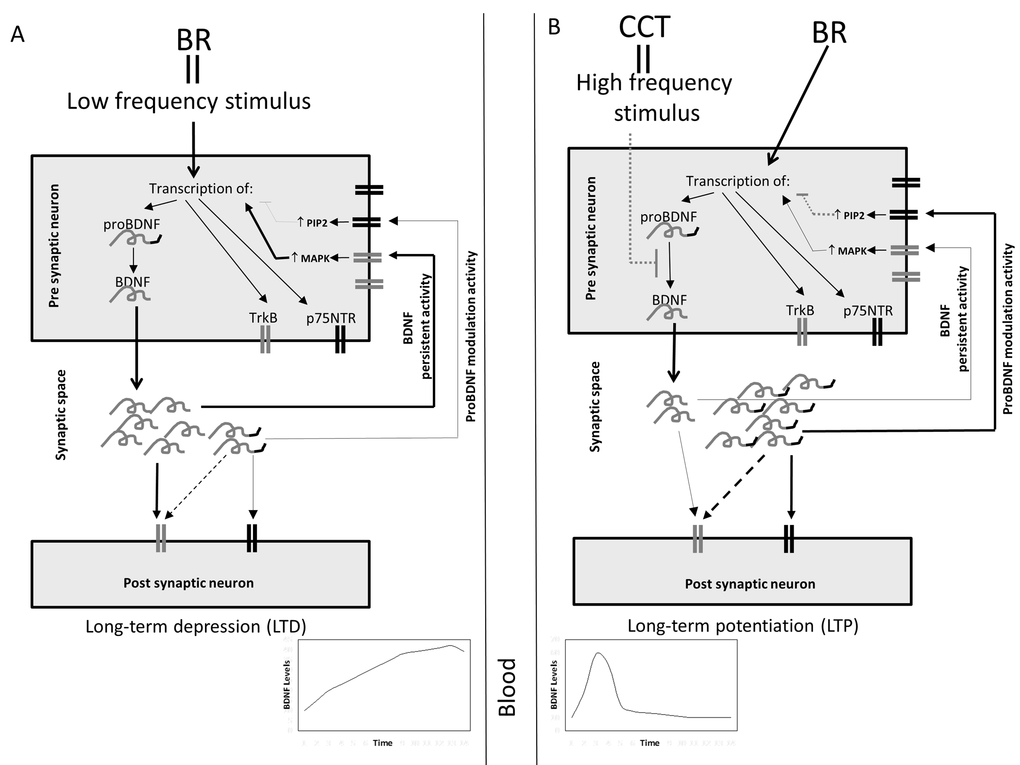 The reason of the differential expression of these molecules might be the frequency of stimulation of the presynaptic cell. It is known that BDNF plays a crucial role in long term potentiation process [42], and that glutamate receptor NMDA is strictly involved in this process [43]. NMDA receptors are implicated both in long term potentiation and depression, based on the frequency of presynaptic stimulation [44]. Possibly, in people undergoing CCT during bed rest, the repeated cognitive stimulation might early induce the fixation of the acquired skills via long term potentiation. A preferential increase of proBDNF might activate p75NTR receptors, inducing their modulatory activity and secondary leading to a reduction of BDNF release. Rapanelli et al. [45] seems to sustain this hypothesis: in their work, in the early phase of training, “learning mice” have hippocampal BDNF levels much higher compared with “trained mice”, that at the end of training program have learned skills. This seems to indicate that, when a task is learned, cellular activation persists but plasticity declines. The above mentioned hypothetical mechanism underlying the observed results is represented in the schematic diagrams reported in Figure 3.
