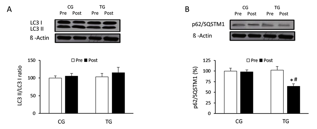 After completing the resistance training program, we found only a slight and non-significant increase in the ratio LC3II/I. Previous data indicate that the conversion of LC3I to LC3II was depressed in skeletal muscle following an acute bout of resistance exercise in young and older participants [27], suggesting a decrease in autophagy. Likewise, 9 weeks of resistance training decreased the LC3II/I ratio in skeletal muscle of aged rats [26]. However, another study did not show any variation of LC3II protein content 1 h after resistance exercise in vastus lateralis muscle from young healthy males subjects [28]. It is important to note that the LC3II/LC3I ratio is involved in early and late stages of autophagic flux, from the formation of the autophagosome to the degradation in the lysosome. Therefore, other markers should be evaluated in order to assess exercise-induced changes in the autophagy process [24,29].