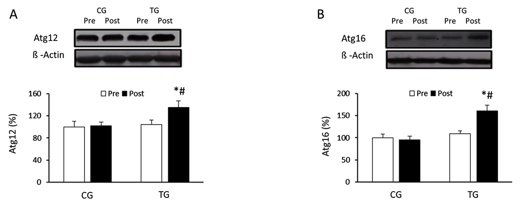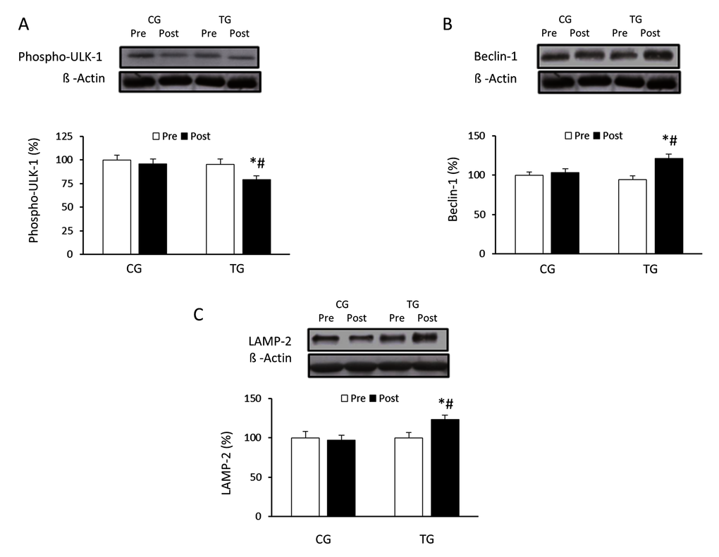 The effects of exercise on the autophagic flux were investigated in PBMCs of the elderly after 8 weeks of resistance training or daily routines. Resistance training induced a non-significant increase in the LC3II/LC3I ratio (p =0.063) whereas CG values did not change (p =0.125) (Figure 1A). p62/SQSTM1 protein level was significantly reduced (p <0.05) in response to resistance exercise, reaching values significantly lower than those from CG after the training period (Figure 1B). Regarding Atg12 (Figure 2A) and Atg16 (Figure 2B), a significant increase in protein content was observed in TG when compared with both pretraining (Atg12, p <0.03 and Atg16, p <0.02, respectively) and CG values after 8 weeks of exercise training (Atg12, p <0.03 and Atg16, p <0.02, respectively). The current training program had opposite effects on the protein content of ULK-1 phosphorylated at serine 757 and beclin-1 (Figure 3A and 3B). While phospho-ULK-1 significantly decreased (p <0.05) after completion of training, beclin-1 increased significantly (p <0.05) as a result of the 8 weeks of training. Phosphorylation of ULK-1 was also significantly lower (p <0.05) and beclin-1 protein concentration significantly higher (p <0.05) in TG than in CG after the intervention period. The resistance training program significantly increased the content of lysosomal protein LAMP-2 compared with pretraining values (p<0.05) and GC after the 8-week intervention (p<0.05) (Figure 3C).