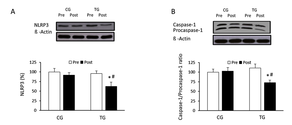 To analyze the effects of resistance training on the expression of the components of the inflammasome and its state of activation in PBMCs of old subjects, protein concentration of NLRP3, pro-caspase-1 and caspase-1 were analysed, as well as the caspase-1/procaspase-1 ratio. After the 8-week training, NLRP3 protein levels decreased significantly in the trained group compared to pretraining values and to CG values at post (p <0.03 and p <0.04, respectively) (Figure 4A). A training effect was observed in the caspase-1/procaspase-1 ratio (Figure 4B); the relative ratio decreased significantly (p <0.04) in response to the resistance exercise protocol.