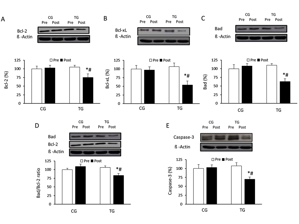 Values are presented as mean ± standard error of means (SEM). Post-training values were normalized to pre-training values. Saphiro-Wilk test was used to verify normal data distribution. All data were analyzed using a two-way analysis of variance (ANOVA) with repeated measures for group (GG and TG) and time (pre and post). Bonferroni analysis was used to compensate for multiple post hoc comparisons. Differences were considered significant when p<0.05. All statistical analyses were performed using SPSS version 18 (SPSS Inc., Chicago, IL, USA).
