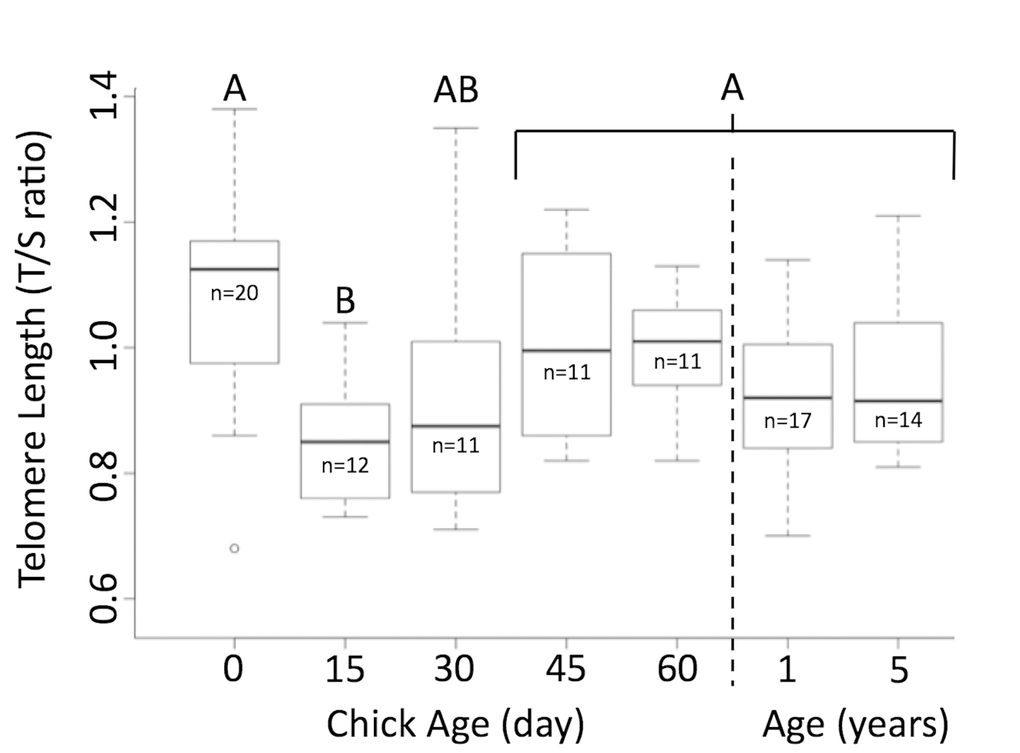 Telomeres were significantly shorter when chicks were 15 days of age than when they hatched (Figure 1). By 30 days of age, telomere length was similar to their length at hatching, and they remained unchanged through 60 days of age (p=0.002, n=65, TukeyHSD, Figure 1). Telomeres of newly hatched chicks, 1-year-old juveniles, and adults aged 5 years were similar in length (p=0.14, n=51). There was no relationship between the change of bill depth, flipper length, foot length or weight and the change in telomere length between day 0 and day 15 (BD: Rsq = 0.246, p=0.07, n =11; FL: Rsq = 0.129, p = 0.15, n = 11; FT: Rsq = -0.076, p = 0.60, n = 11; WT: Rsq = 0.101, p = 0.18, n = 11). However, there was a significant correlation in the change of bill length and telomere length change from day 0 to day 15 (Rsq = 0.374, p = 0.026, n = 11). One chick, that had very little change between 0 and 15 days, drove this trend, so it is unlikely to be biologically meaningful. Those individuals that survived to fledging and those that died while nestlings had similar telomere lengths (t= 0.792, p=0.43, n=20).