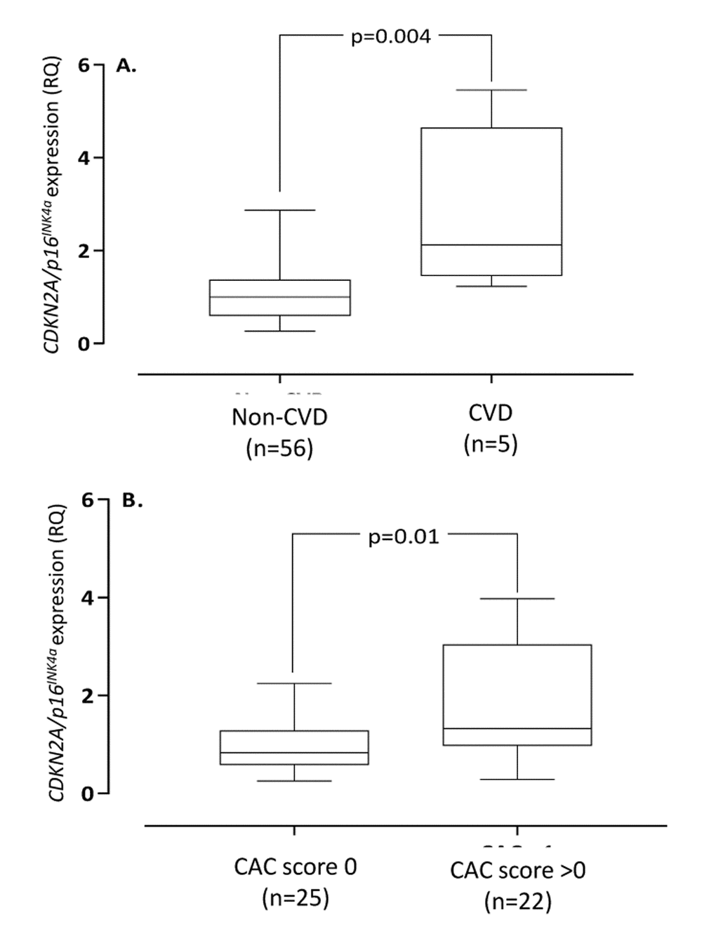 Demography, biochemical data and arterial expression of CDKN2A/p16INK4a, CDKN2B/p15INK4a, RUNX2 and MGP in the different groups of VC (none, mild, moderate and severe) are summarized in Table 1. No differences (p=0.15) in the number of no/former/present smokers were found in the calcification groups (no VC; 8/1/0, mild VC; 16/14/0, moderate VC; 7/7/0, severe VC; 3/1/0). Moreover, no difference (p=0.39) in physical activity (graded as regular, normal activity and disabled) was reported in the calcification groups (no VC; 2/6/1, mild VC; 18/13/1, moderate VC; 6/7/2, severe VC; 1/2/1). The arterial expression of CDKN2B/p15INK4a did not show any significant correlations with age, biomarkers of bone, inflammation and oxidative stress as well as extent of VC, coronary artery calcification (CAC) score or CVD. In contrast, the arterial CDKN2A/p16INK4a expression was significantly higher (Fig. 1) in patients with CVD compared to patients without CVD (median relative expression quantity 2.12 vs. 1.00, p=0.004), even after correction for age in multivariate analysis (p=0.01). Patients with CVD (632; IQR 79-1702) had significantly (p=0.0008) higher median CAC score than patients without clinical signs of CVD (0; IQR 0-64).
