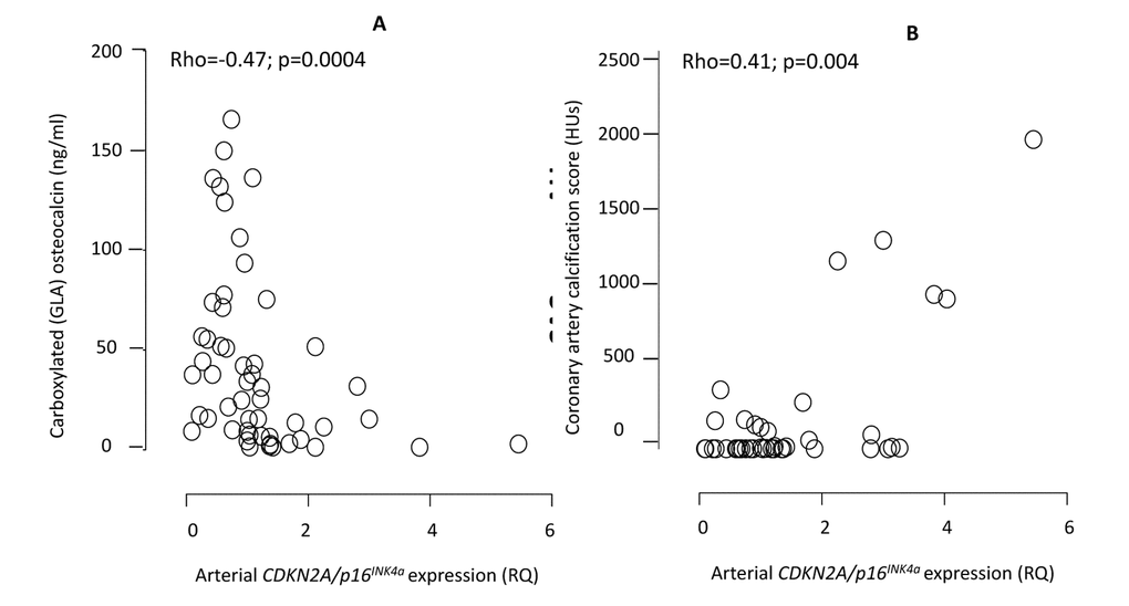 The arterial expression of CDKN2A/p16INK4a correlated (Rho=0.34; p=0.006) with chronological age (Suppl. Fig. 2). Patients with CAC-score >0 had significantly higher (median relative expression quantity 1.32 vs. 0.83 RQ; p=0.01) arterial expression of CDKN2A/p16INK4a than patients with CAC score 0 (Fig. 1), but not after correction for age (p=0.12). The correlation between CDKN2A/p16INK4a and media calcification was borderline (Rho=0.26; p=0.06) significant in univariate analysis (Suppl. Fig. 3) but reached statistical significance (p=0.0003) after multivariate correction for chronological age. The arterial expression of CDKN2A/p16INK4a correlated with CAC score (Rho=0.41; p=0.004), IL-8 (Rho=0.31; p=0.016), IGF-1 (Rho=-0.30; p=0.02), testosterone (males only) (Rho=-0.50; p=0.001), Mid-fragments (MID)-osteocalcin (OC) (Rho=-0.52; p<0.0001), inactive GLU-type (GLU)-OC (Rho=-0.54; p<0.0001) and active GLA-type (GLA-OC) (Rho=-0.47; p=0.0004). The correlations between CDKN2A/p16INK4a and GLA-OC and CAC score are depicted in Figure 2. Median N-MID OC (27.0 vs. 115.4 ng/ml; p=0.013), GLU-OC (3.1 vs 34.4 ng/ml; p=0.02) and GLA-OC (13.3 vs. 45.5 ng/ml; p=0.014) were significantly lower in patients with CVD.