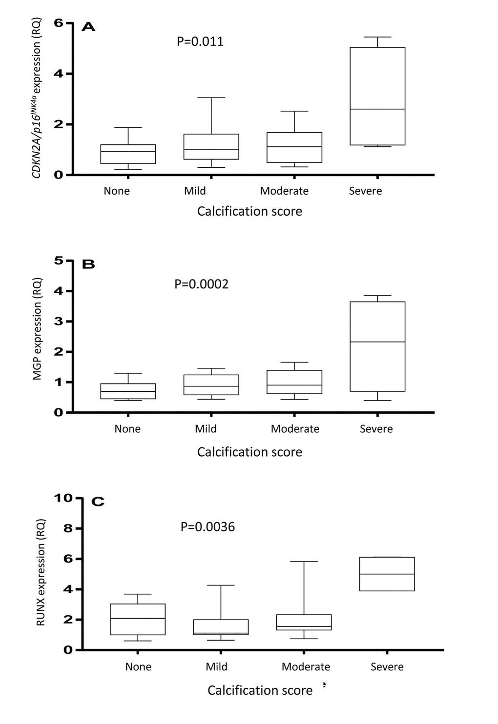 As shown in Figure 3, arteries with severe medial VC exhibited significantly higher vascular expression of RUNX2 (p=0.0036), MGP (p=0.0002) and CDKN2A/p16INK4a (p=0.011). The arterial expression of CDKN2A/p16INK4a was significantly correlated to the expression of MGP (Rho=0.31; p=0.02), but not RUNX2 (Rho=0.21; p=0.16). The degree of media calcification (%) correlated to total CAC score (Rho=0.59; p<0.0001) and MGP expression (Rho=0.38; p=0.008), but not to RUNX2 expression (Rho=0.14). Total CAC score correlated to arterial MGP expression (Rho=0.38; p=0.016) but not to RUNX2 expression (Rho=-0.01).