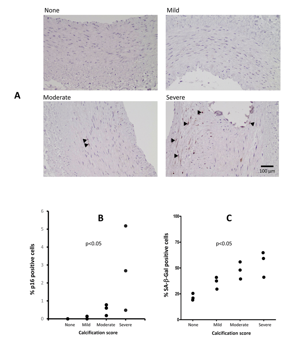 Expression of p16INK4a in epigastric artery was absent, or low, in patients with no or mild VC, but was increased in moderate VC and further exacerbated in severe VC (Fig. 4). Cells positive for p16INK4a were localized to the vascular media and in severe VC also in the intima and were more frequent (p<0.05) in areas with extensive calcification. The cellular localization of p16INK4a was mostly nuclear. The p16INK4a protein expression pattern mirrored the expression of CDKN2A/p16INK4a. The number of SA-β-Gal positive cells was significantly (p<0.05) higher in severely calcified arteries (Fig. 4).