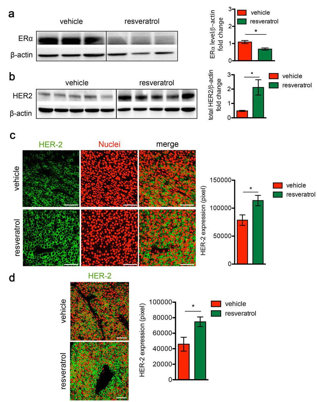 To investigate the molecular mechanisms underlying the boosted cancer growth induced by resveratrol, ERα and Δ16HER2 protein levels were analyzed by western blot in tumors explanted from resveratrol-treated and control mice. We found that in vivo administration of resveratrol caused a dramatic drop in the ERα expression (Figure 2a, p<0.05) and a concomitant increase in Δ16HER2 protein level (Figure 2b, p<0.05) in tumors. Confocal microscopy analysis confirmed the significant higher abundance of Δ16HER2 in both primary tumors (Figure 2c) and lung metastatic lesions (Figure 2d, p<0.05) from resveratrol-treated mice compared to controls. These data suggest that the effect of resveratrol on Δ16HER2 protein accumulation is similar in primary tumors and metastases, although resveratrol supplementation did not seem to influence the number of lung metastases (3 out of 6 mice were found with pulmonary metastases in the vehicle group, 4 out of 7 mice in resveratrol-group, Figure S1).