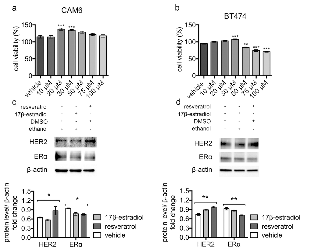 To confirm the pro-tumor effect of resveratrol in human Δ16HER2+/ERα+ breast cancer, we tested resveratrol in vitro on human BT474 and murine CAM6 cell lines. CAM6 cells have been established from Δ16HER2 mice and can be considered the in vitro counterpart of Δ16HER2 mammary tumors [17]. After 24 hours’ incubation, despite high resveratrol concentrations resulted in reduced cell viability, low-range resveratrol concentrations (20-30 µM) promoted cell proliferation of both CAM6 and BT474 cells (Figure 3a and 3b), mimicking the in vivo resveratrol effect. Consistently, western blot analysis revealed that treatment with 40 µM resveratrol for 24 hours induced HER2 up-regulation and a concomitant ERα down-regulation in both CAM6 and BT474 cells, recapitulating the molecular events observed inside Δ16HER2 tumors (Figure 3c and 3d). Since 10 nM 17β-estradiol treatment only partially reproduced the resveratrol effect in CAM6 cells, inducing reduction of ERα without enhancing HER2 protein levels, we suppose that resveratrol exerts a more complex action on Δ16HER2+ cancer cells than the mere estrogen-like effect.