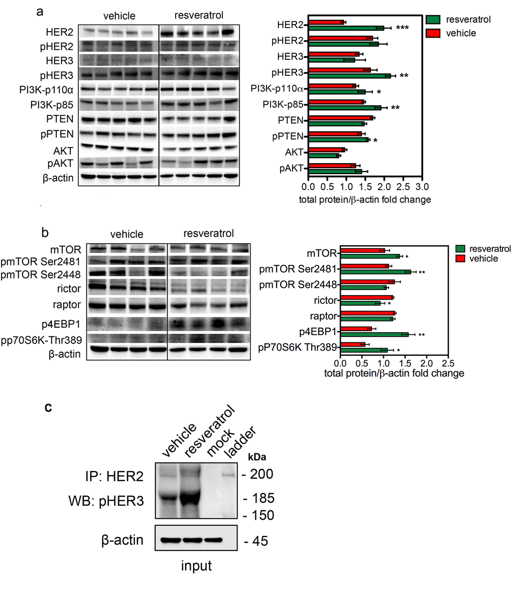 To identify the signaling cascades beneath the resveratrol-induced Δ16HER2 accumulation, the main oncogenic pathways known to be involved in breast carcinogenesis were analyzed by western blot. As shown in Figure 5a, despite tumors from resveratrol-treated mice expressed significantly higher Δ16HER2 levels than vehicle counterparts, no relevant differences were detected in its phosphorylation status. Noteworthy, phosphorylated HER3 levels were significantly higher in tumor extracts from resveratrol-treated animals (Figure 5a). Consistent with the over-expression of Δ16HER2 and increased HER3 phosphorylation, tumors displayed high levels of Δ16HER2-HER3 heterodimer upon resveratrol treatment, as measured by co-immunoprecipitation assay (Figure 5c). This result suggests that resveratrol-induced accumulation of Δ16HER2 leads to Δ16HER2/HER3 heterodimer formation and consequently to HER3 transactivation. It is known that HER2/HER3 heterodimers are powerful oncogenic units, in part because phospho-HER3 boosts PI3K-AKT-mTOR signaling pathway [18]. Consistently, we found that resveratrol-induced Δ16HER2/HER3 heterodimerization caused a concomitant increase in the levels of PI3K p85 and PI3K p110α (PI3K-p85, p<0.01 and PI3K-p110α, p<0.05) and the up-regulation of the mammalian target of rapamycin complex 1 (mTORC1). The mTOR Ser/Thr kinase is the catalytic component of two structurally and functionally distinct signaling complexes. The rictor-containing mTORC2 regulates the actin cytoskeleton and activates Akt [19]. The raptor-containing mTORC1 regulates cell growth and nutrient signaling [20]. In particular, mTORC1 phosphorylates p70 S6 kinase (S6K) and eukaryotic initiation factor 4E binding protein 1 (4EBP1), thereby regulating translation of proteins that are critical for progression from G1 into S phase [21]. Therefore, we examined levels of phospho-4EBP1 and phospho-S6K as readouts of mTORC1 activity. As shown in Figure 5b, resveratrol significantly increased both phospho-4EBP1 (p<0.01) and phospho-S6K levels (p<0.05) relative to vehicle. The phosphorylation of these two par excellence mTORC1 downstream effectors positively correlated with the level of mTOR Ser(P)-2481, while lower rictor and mTOR Ser(P)-2448 pointed toward inhibition of mTORC2. Interestingly, although resveratrol supplementation promoted the inhibiting phoshorylation of PTEN (pPTEN ser380/thr382/383) [22], no differences in terms of AKT activation (pAKT) were observed between resveratrol and control groups: this may be due to feedback loops that compensate PI3K-mediated AKT activation. Interestingly, other pathways known to be activated downstream Δ16HER2, such as the Δ16HER2/Src/STAT3 axis, did not vary significantly between the two experimental groups (Figure S4). It is worth to note that the levels of unphosphorylated proteins other than HER2, like mTOR (Figure 5b), Src and Erk1,2 (Figure S4) increased in tumor extracts from resveratrol group. This observation is consistent with the ubiquitin-proteasome system (UPS)-dependent degradation of these proteins [23–26] and supports our evidence about resveratrol acting as proteasome inhibitor.