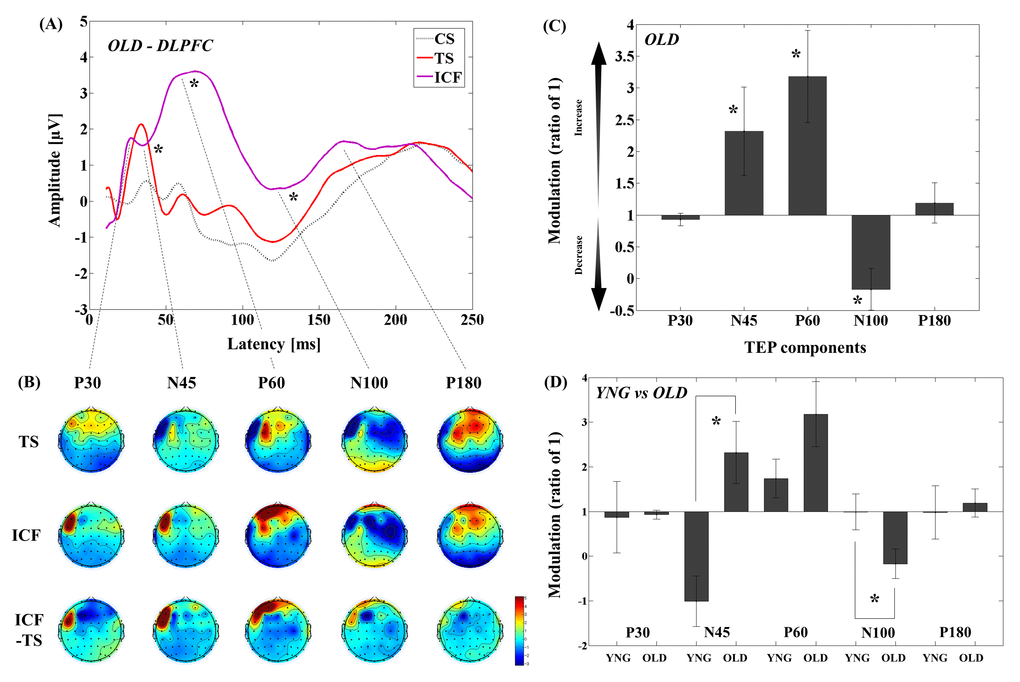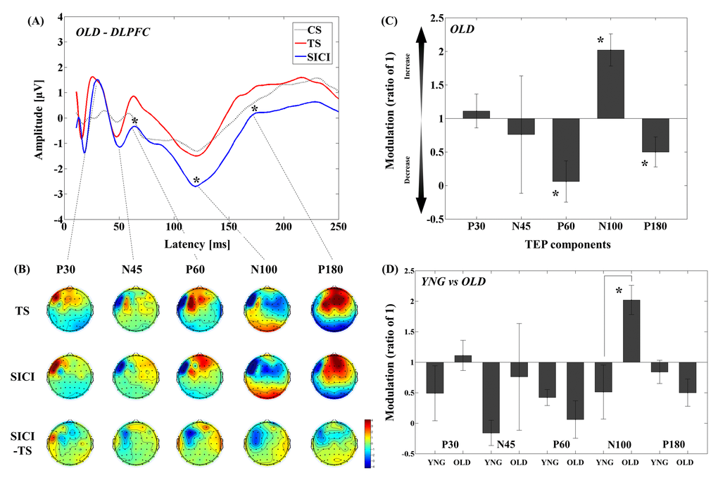 Recently, we have established a combined TMS–EEG technique to measure the SICI and ICF paradigms from the DLPFC [11]. The development of this technique allows for the assessment of GABAergic and glutamatergic functioning in a cortical region involved in the effects of aging on cognition and emotion.