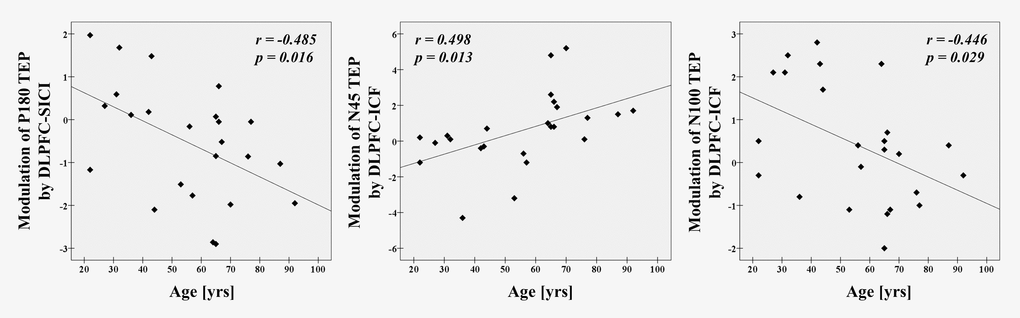 The correlation analyses between age and TEP modulations with SICI as well as ICF paradigms at the left frontal ROI were performed with Pearson’s correlation coefficient for the significant results obtained from the above ANOVA. We further explored correlations between TEP modulations with SICI and ICF paradigms. A significant level of α = 0.05 was applied. The sample size of subjects was based on a previous study in 12 younger healthy controls [11].
