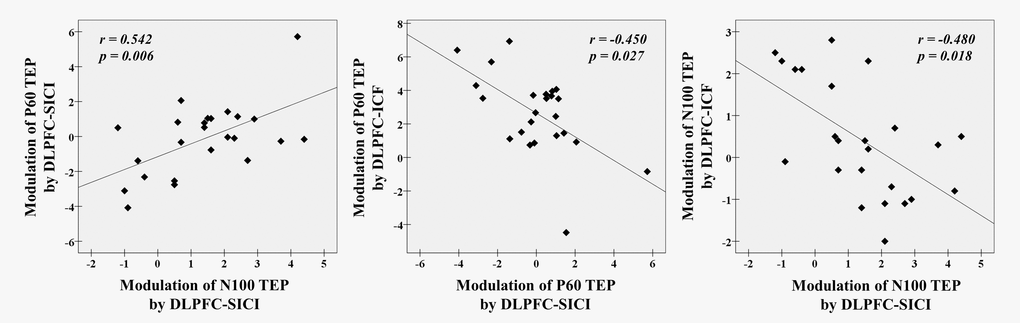 In SICI paradigm, there was a significant correlation between modulations of P60 and N100 TEPs (r = 0.542, p = 0.006, N = 24, Figure 4). For the ICF paradigm, there were no correlations between TEP modulations. Between SICI and ICF paradigms, we observed significant correlations of TEP modulations between P60 in SICI and P60 in ICF (r = -0.450, p = 0.027, N = 24), and between N100 in SICI and N100 in ICF (r = -0.480, p = 0.018, N = 24). Since N100 modulation by ICF was significantly associated with age, we did a partial correlation using age as a covariate and found that the positive correlation between modulations of N100 in SICI and ICF remained significant (r = -0.389, p = 0.033, N = 21). These correlations are depicted in Figure 4.