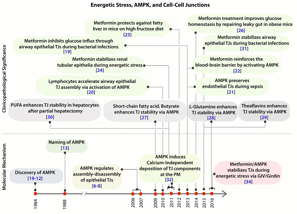 Besides the pathways mentioned above, regulation of polarity requires an additional signaling component which is triggered exclusively under conditions of energetic stress. Three studies [6-8] published in 2006-07 simultaneously reported a surprising role of AMP-activated protein kinase (AMPK) in the maintenance of epithelial cell polarity and barrier functions (Figure 1). Discovered in 1984 [9-12], and named subsequently in 1988 [13], AMPK is unique in that it is a metabolic sensor protein which is activated exclusively during energetic stress. It is because of its ability to couple energy sensing to cell polarity, activation of AMPK was critical for protecting cell junctions against stress-induced collapse. Using polarized epithelial [Madin Darby Canine Kidney (MDCK)] cells it was demonstrated that AMPK is activated during calcium (Ca2+)-induced tight junction (TJ) assembly [6,7]. The catalytic activity of AMPK is critical because either depletion of the AMPK catalytic α-subunit or expression of a kinase-dead mutant of AMPK inhibits TJ assembly as indicated by a loss of transepithelial electrical resistance (TEER); the latter is a measure of paracellular ion flow which depends on TJ stability. Pharmacological activation of AMPK with 5-aminoimidizole-4-carboxamide riboside (AICAR) partially protects TJs despite Ca2+ depletion [6,7]. These findings closely followed another major revelation that the tumor suppressor LKB1 (Liver Kinase B1; also known as Serine/Threonine Kinase 11 - STK11) is a direct activator of AMPK [14-17], and that defects in cell polarity precede the development of tumors [pancreatic ductal adenocarcinoma] in genetically modified mice with tissue-specific deletion of LKB1 [18]. Together, these discoveries established the first links between energetic stress, cell polarity and oncogenesis. Since then, multiple studies (summarized in Figure 1) have reported the protective role of AMPK in maintaining cell-cell junctions across a variety of cell types in diverse tissues [airway and lungs [19,20], heart [21], the blood-brain barrier [22,23], kidney [24], intestine [25-29], liver [30]] while mounting a pathologic response to a variety of stressors, from bacterial invasion [31] to ischemia [24].