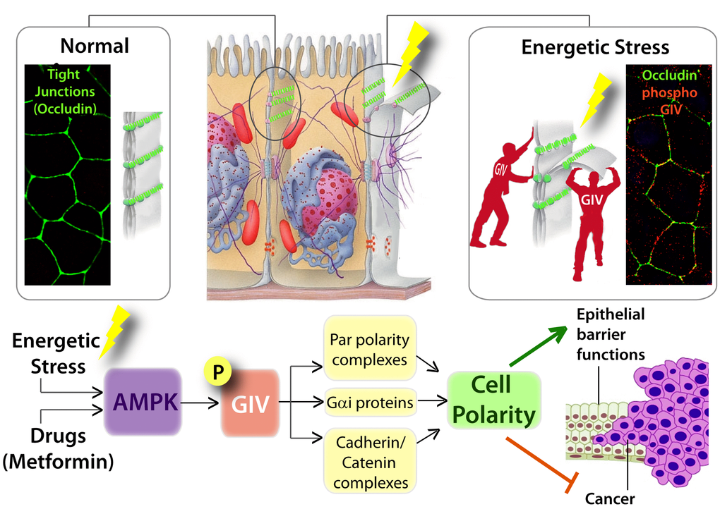 A recent study [34] demonstrated that GIV (G-alpha interacting vesicle associated protein, a.k.a. Girdin), a multimodular polarity scaffold protein is a novel substrate of AMPK, and defined the molecular mechanisms by which the AMPK-GIV signaling axis protects the epithelium by stabilizing TJs and preserving cell polarity when challenged with energetic stress. GIV, a guanine nucleotide exchange factor (GEF) for trimeric G proteins, had previously been shown to serve as a polarity scaffold protein that regulates epithelial cell polarity and morphogenesis [35-37]. GIV’s role at cell-cell junctions has been attributed to its ability to assemble various functional complexes with its C-terminus, e.g., (i) binding the Par3/Par6/aPKC polarity complex [36,38]; (ii) binding and modulating the endocytic trafficking of E-cadherin [39]; (iii) linking cadherin-catenin complexes to the actin cytoskeleton [37]; and finally, (iv) binding and activating G protein, Gαi via its GEF motif and maintaining epithelial polarity through the Par polarity complex [36]. Each of these functional associations of GIV earned it the title of ‘polarity scaffold protein’ and have been implicated in the generation of cell polarity.