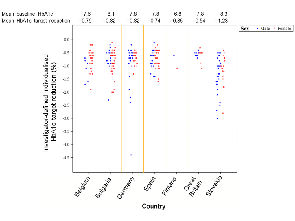 A summary of the individualized HbA1c targets set by the investigators by countries is provided in Figure 1. The mean overall HbA1c target reduction was −0.9% (range, −4.4% to −0.1%). In patients with HbA1c up to 8.0%, the mean individualized target reduction was less stringent, −0.7% (range, −2.4% to −0.1%), whereas in patients with HbA1c >8.0% the mean individual target reduction was −1.2% (range, −4.4% to −0.2%).