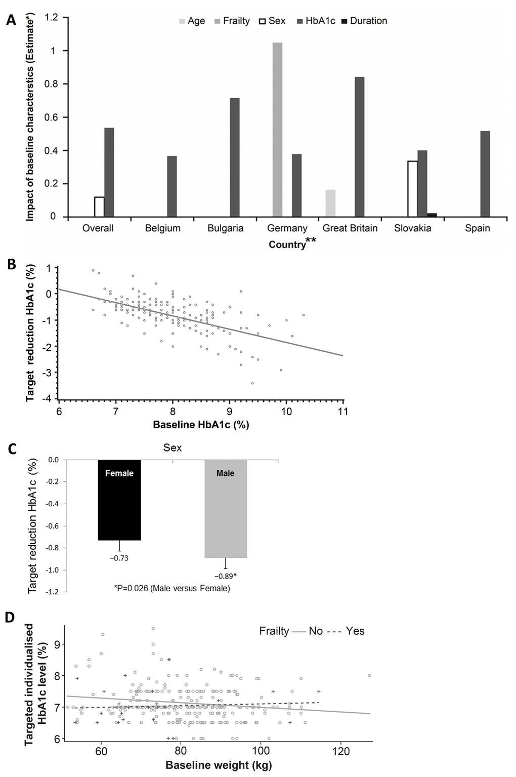 The impact of baseline characteristics on target setting, overall and by country, is summarized in Figure 2a. In the overall study, screening HbA1c was positively associated with the target reduction such that for every 1% increase in the baseline HbA1c, the target reduction was increased by −0.5% (Pearson’s correlation −0.6353; P<0.001; Figure 2b). Men were set more aggressive targets than women (P=0.026; Figure 2c), whereas the frailty status only demonstrated a trend towards significance (P=0.068). In non-frail patients, the baseline weight was a predictor of a less aggressive glycemic target setting (P=0.012) such that more obese patients were set more aggressive targets, while in frail patients, a lower body weight did not additionally impact the glycemic target (P=0.725; Figure 2d). Interestingly and unexpectedly, neither age (P=0.510) nor the duration of diabetes (P=0.760) had an impact on the targets set. Hematological and biochemical parameters also did not seem to predict the target established. Physicians did not seem to consider the degree of polypharmacy when setting targets (P=0.301); the addition of the number of concomitant prescriptions and other medications to the analysis model did not significantly alter any of the associations.