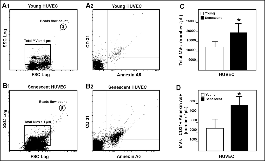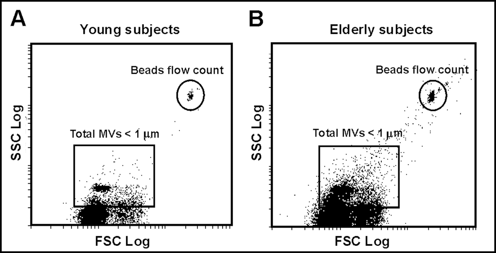 Flow cytometric analysis of the plasma-derived MVs from both the young and elderly subjects localized the MVs population around the forward scatter signal corresponding to particles with a diameter of around 1 μm (Fig. 1). Figure 1B shows that the plasma of the elderly subjects contained a greater number of total MVs.