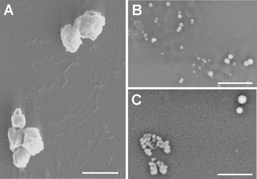 SEM analysis showed the HUVEC-derived MVs to be a heterogeneous population of spherical and elongated structures ranging from 0.2 to 1.8 μm along their longest axis (Fig. 5A). Large MVs were more commonly produced by senescent HUVEC than young HUVEC. Microanalysis revealed the MVs from all sources to have a heterogeneous atomic composition (as demonstrated by the heterogeneous brightness of the MVs; in EDS analysis, elements with a higher atomic number appear brighter because they emit more backscatter signal) (Fig. 5B and C).