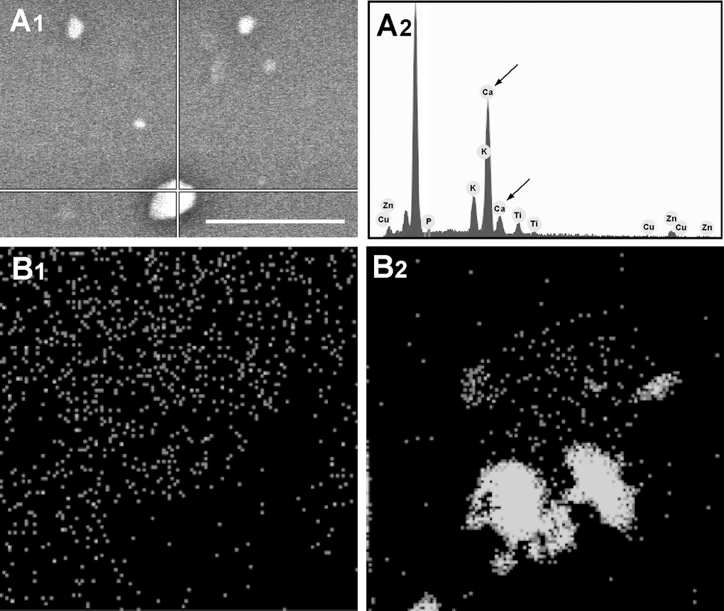 For Ca microanalysis, non-metal-coated MVs were prepared using a Hitachi TM-1000 SEM with an EDS system. For Ca mapping, MVs samples were fixed in 70% ethanol and deposited on a formvar-coated copper grid and analysed using a Zeiss LEO 906E transmission electron microscope (TEM) equipped with an elemental analysis environmental module.