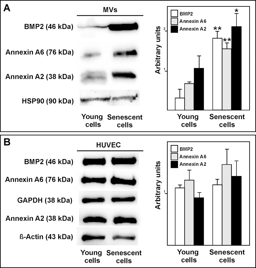 Extracts from young and from senescent endothelial cells, and MVs from young and from senescent HUVEC were lysed in CytoBuster Protein Extraction Reagent lysis buffer (Millipore) containing protease and phosphatase inhibitor cocktail (Roche). The total protein content of lysates was quantified using a BCA Protein Assay Kit (Pierce), with BSA as the standard. Briefly, equal amounts of protein (10-50 μg protein/lane) were diluted with reducing sample buffer and separated by SDS/PAGE (10% gel) under reducing conditions. Samples were then transferred onto nitrocellulose membranes (BioRad), blocked in TBS containing 0.1% Tween 20 and 5% dry non-fat milk for 1 h at room temperature, and incubated in the same buffer with different primary antibodies (BMP2, Abcam ab82511, dilution 1:1000, 46 kDa; annexin A6, Abcam ab31026, dilution 1:1,000, 76kDa; annexin A2, Abcam ab41803, dilution 1:1000, 38 kDa). Anti-β-actin (Santa Cruz) (sc-47778, dilution 1:2000, 43 kDa) or GAPDH (Millipore) MAB374, dilution 1:2000, 38 kDa) was used as a loading control for endothelial cells, and anti-HSP90 (Cell Signaling) (CST#4874, dilution 1:1000, 90 kDa) was used as a loading control for MVs. After washing, the membranes were incubated with Novex horseradish peroxidase-conjugated secondary antibodies (1:5000). Bands were visualized with Luminata Crescendo Western HRP substrate (Millipore). The quality of proteins and efficacy of protein transfer was evaluated by Red Ponceau staining. Bands were quantified using Image J software (NIH) and normalized to anti-HSP90 in MVs and anti-GAPDH or anti-β-Actin in HUVEC.