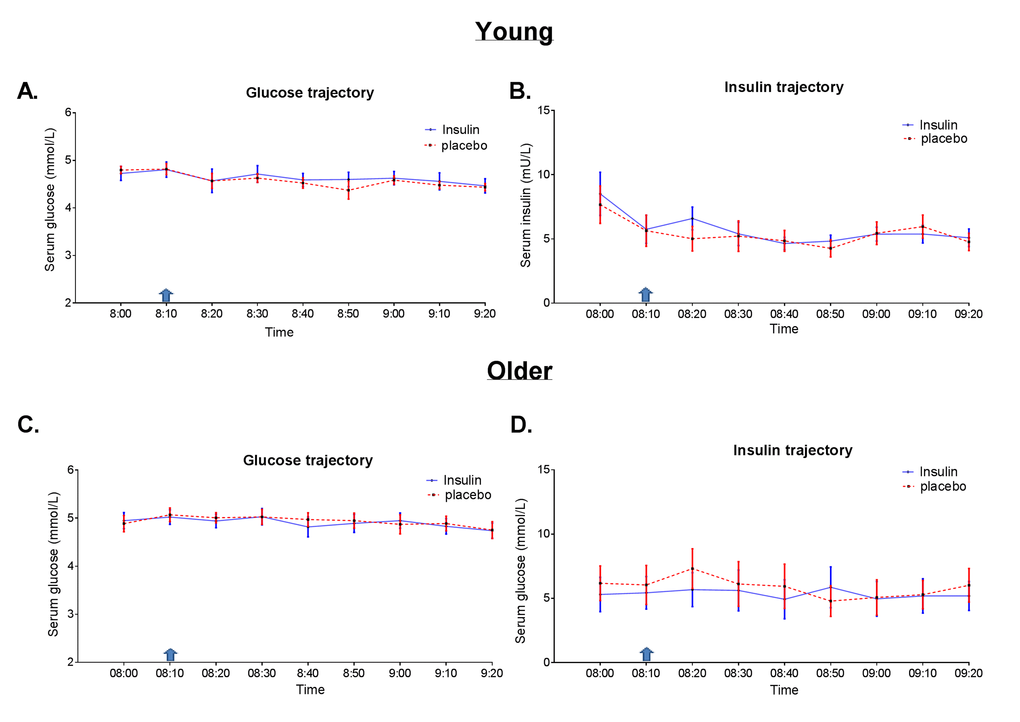The design is a double-blinded, randomized, cross-over, placebo controlled trial in volunteers from the general population. This study was aimed at examining the effects of intranasal insulin on circulatory metabolic and endocrine parameters, as well as on resting and functional brain activities using MRI, in older and young adults. Fourteen elderly and nine young relatively healthy men (age criteria 60-85 years for older adults and 18-35 years for young adults), with a body mass index (BMI) between 20 kg/m2 and 27 kg/m2 were recruited from the general population. Exclusion criteria included fasting plasma glucose above 7 mmol/l, anemia (haemoglobin < 7.1 mmol/l), presence of anatomic deviations of the nose, any significant endocrine, neurological and cardiovascular diseases, or use of medication known to influence lipolysis, thyroid function, glucose metabolism, GH/IGF-1 secretion or any other hormonal axis. Furthermore, persons with a current smoking or alcohol addiction or history of substance abuse were excluded. Of the 23 participants that were contacted via telephone, three (older) participants were excluded after screening. The reasons for exclusion were uncontrolled high blood pressure (n=1) and renal insufficiency (n=2). Of these, all participants except for one (young) successfully completed the study. The reason for the drop-out was phobia for cannulas/ blood withdrawal.