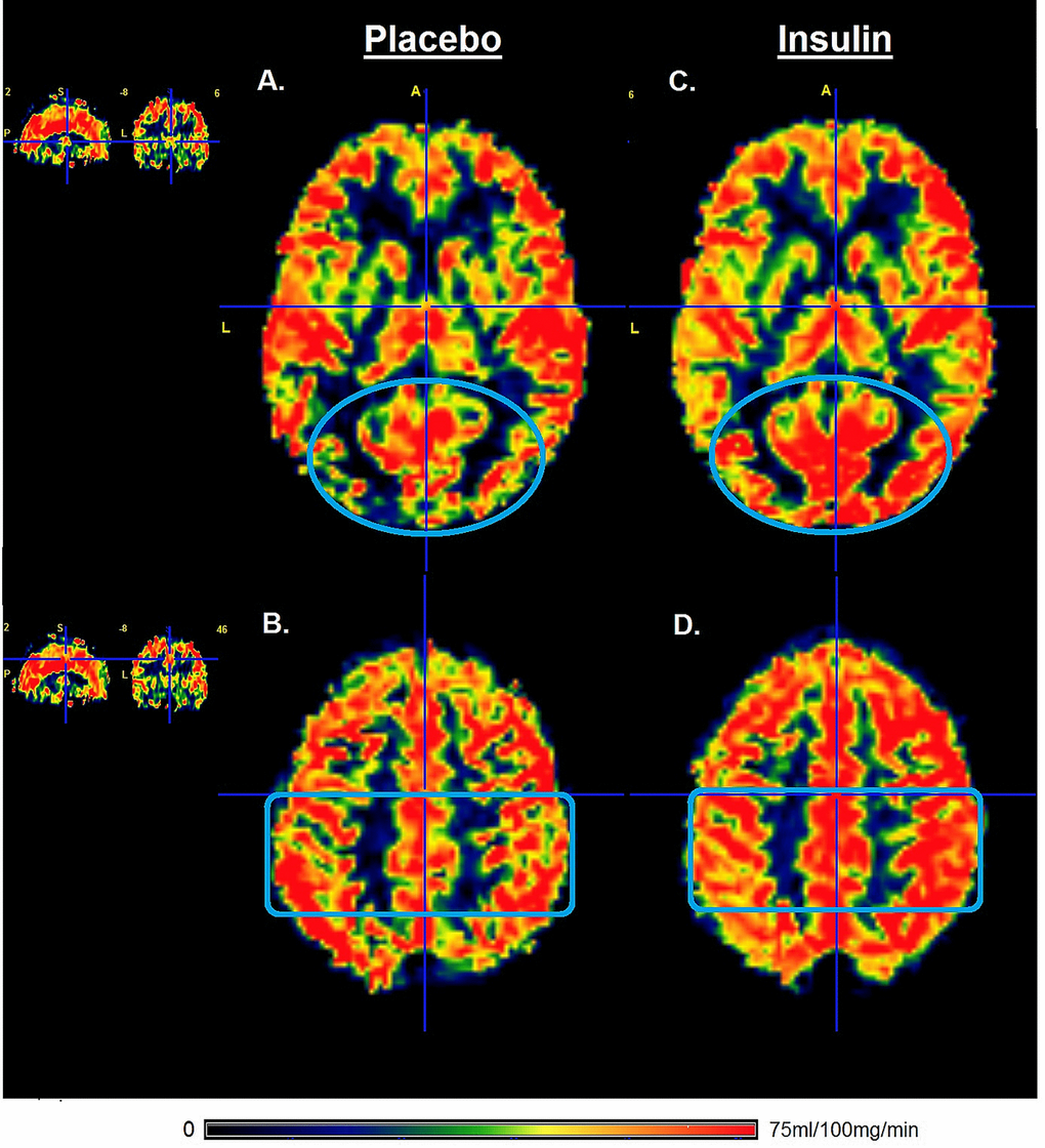 In this proof of principle, randomized, placebo-controlled trial, we investigated the effects of intranasal insulin administration on cerebral blood flow and perfusion in healthy older and young adults.