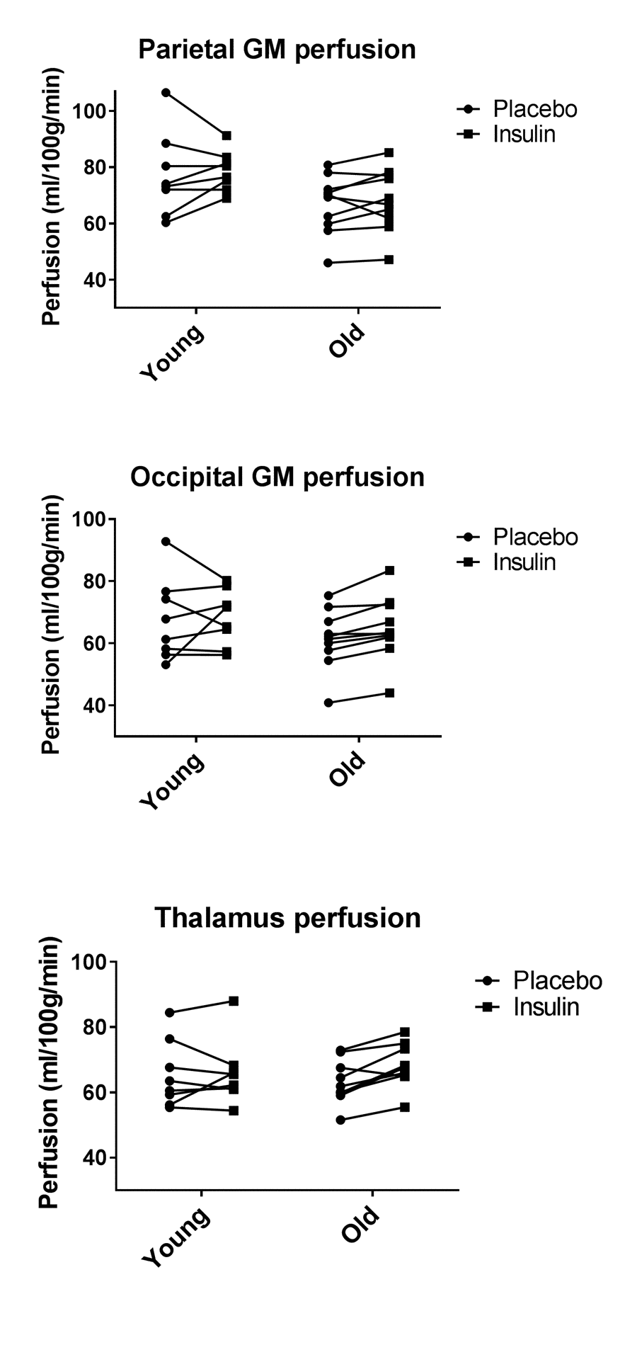 Figure 3 shows the paired gray matter perfusion in the parietal and occipital lobes and in the thalamus for every individual subject separately to illustrate individual differences between the placebo and insulin.