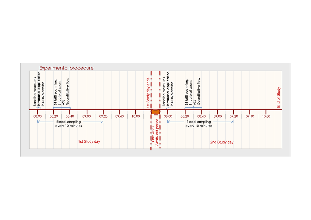 In the morning after a 10-hour overnight fast, participants arrived at the MRI facilities at 08.00 in the morning. A catheter was placed in a vein of the forearm of the non-dominant hand. First, a baseline venous blood sample was collected in a serum-separator (SST)-tube. Thereafter, every 10 minutes, 4 ml of blood was collected into a SST-tube and 2 ml into K3-EDTA tube. Ten minutes after the first blood withdrawal, the trial medication (placebo or 40 IU of insulin) was administered intranasally, under the supervision of the experimenter, with a ViaNase Electronic Atomizer. Participants were asked if they noticed a specific smell or noticed something about the applied treatment. However, participants were not informed that the smell could be associated with the treatment and therefore would remain unaware of the applied intervention. We checked this by questioning the participants of the awareness of the treatment condition and this did not coincide with the actual applied treatment after de-blinding of the study. About 20 minutes after the intranasal application, participants were transferred into the MRI for the scanning procedure (Figure 4). About 30 min after the intranasal application, the CBF measurement was performed in the MRI scanner. This time interval was chosen because previous studies have shown that it takes 30 minutes for insulin to reach maximal concentrations in the CSF [19], and a similar time window has been used previously in other studies where brain – related effects of intranasal insulin were studied [20–22].