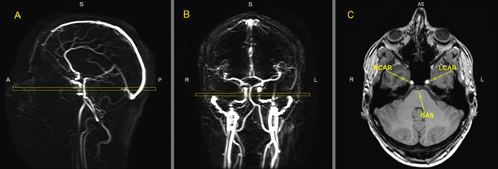 Quantitative flow measurements were performed using ungated phase-contrast MRA, based on 2 localizer MR angiograms in the sagittal and coronal orientation as shown in Figure 5. A region of interest (ROI) was drawn around the vessel lumen on the magnitude images by an experienced rater using Philips Software on a PACS (Philips Medical Systems, Best, The Netherlands) workstation with ROI measurement tools. Flux was measured for basilar artery and both internal carotid arteries separately. Total flux was calculated for all three vessels together.