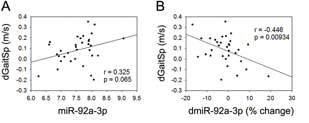 None of the 4 miRNAs that were altered with AEX (miR-376a-5p, miR-16-5p, miR-27a-3p, and miR-28-3p) were associated with gait speed changes in response to AEX (data not shown); thus, we analyzed whether other abundant circulating miRNAs were associated with gait speed changes. We found that changes in gait speed were negatively associated with baseline levels of miR-181a-5p, but not with percent changes in miR-181a-5p with AEX (Figure 2). In addition, changes in gait speed showed a trend for a positive correlation with baseline levels of miR-92a-3p, but negatively correlated with percent changes in miR-92a-3p levels (Figure 3). These associations persisted or became stronger after adjustment for age and gender. Since gait speed changes were not associated with changes in body mass (data not shown), we did not include change in body mass in the model.