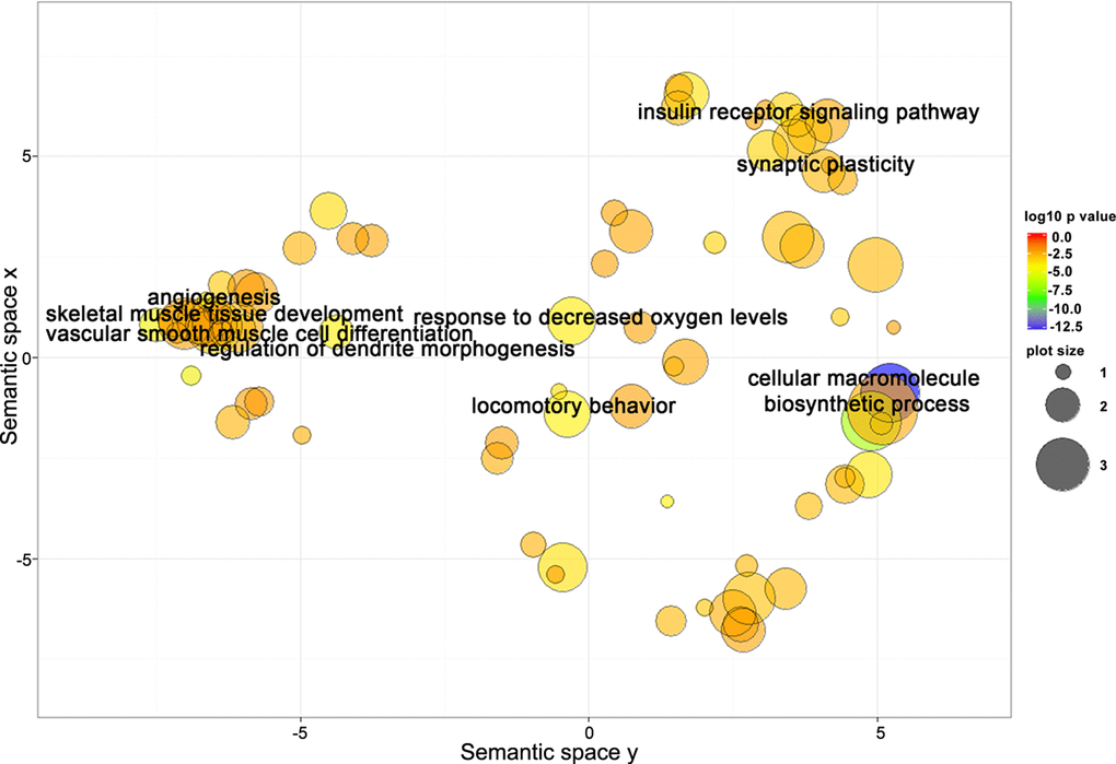 Target genes shared between miR-181a-5p and miR-92a-3p are closely related to biological processes involved in the regulation of neural, skeletal muscle, and vascular function. To better understand the underlying mechanisms related to miR-181a-5p and miR-92a-3p’s involvement in gait speed responses to AEX, we next performed analysis of their target genes. Using the multiMiR R analysis, we detected 1,569 target genes for miR-181a-5p and 1,997 genes for miR-92a-3p, 353 of which were common to both. Go analyses yielded 139 BP Go terms for miR-181a-5p target genes, 176 terms for miR-92a-3p target genes, and 104 terms for the common genes. Using REViGO to remove redundant GO terms revealed that a complex set of genes involved in muscle, vascular and neural physiology regulation could be involved in the response to AEX among obese older adults (Figure 5).